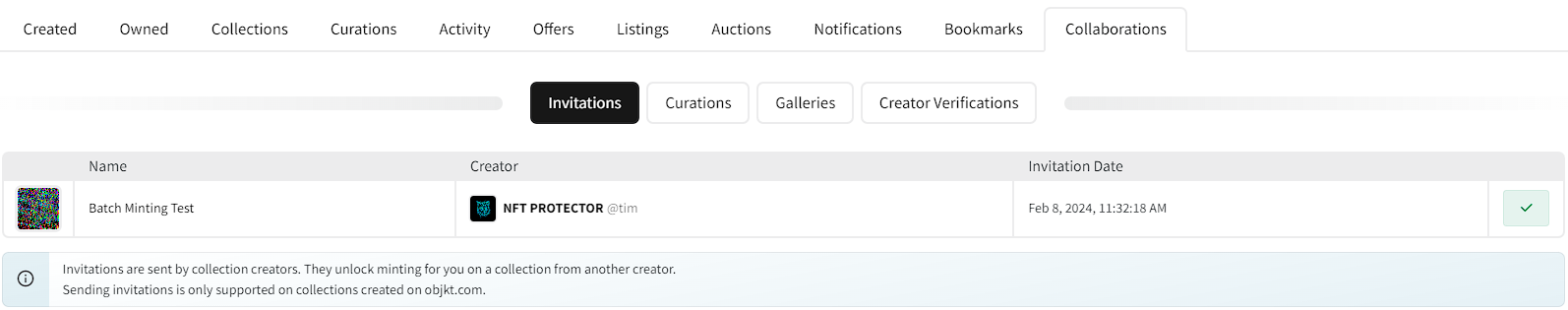 Clicking on Accept will create a transaction that accepts the invite. Once the invite is accepted, the user will appear on the collection as a collaborator. Also, the user will be able to mint tokens into the collection and you'll be able to accept the user as a collaborator on any token minted into that collection.